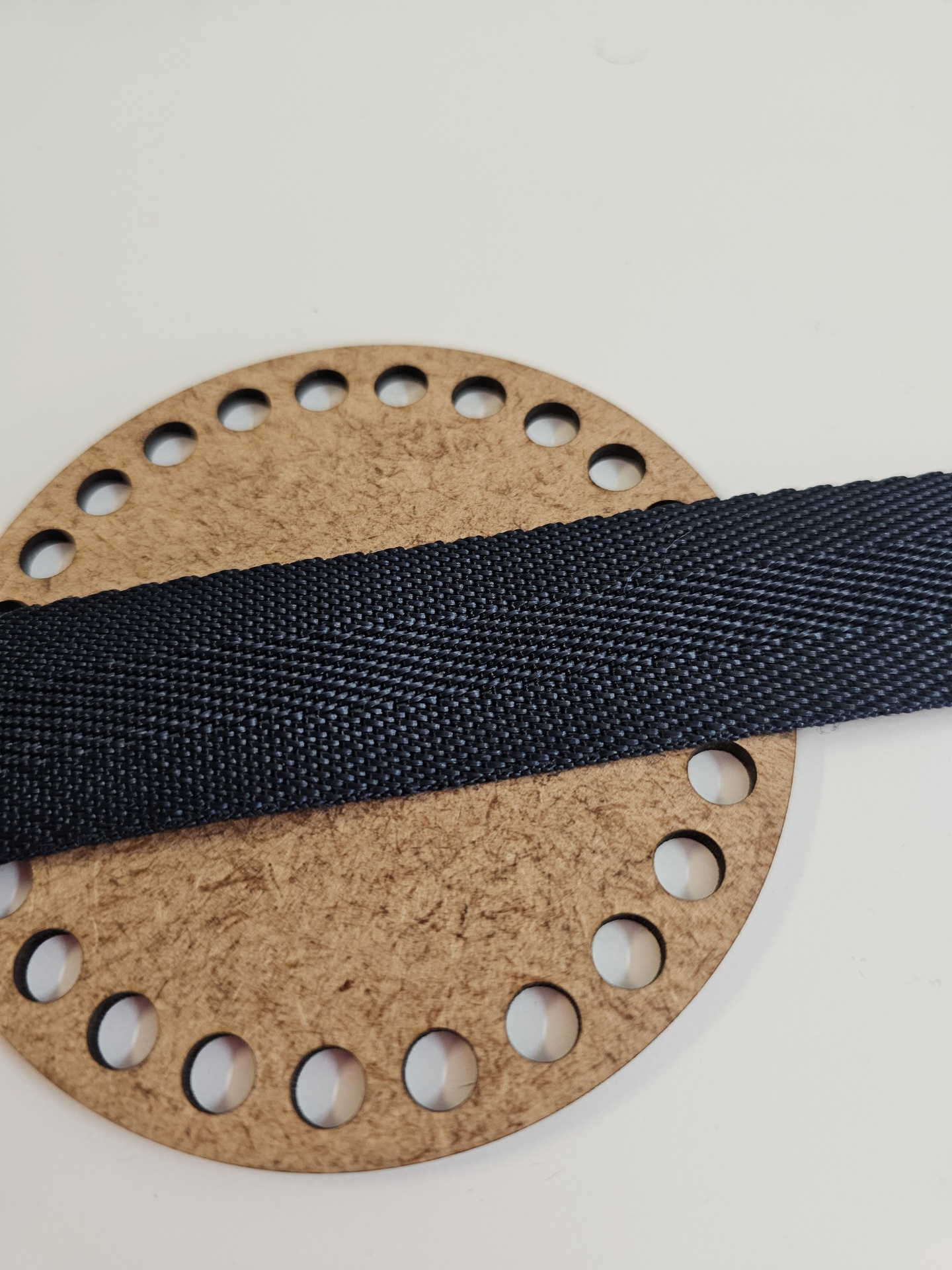 Círculo de cortiça com furos e fita preta texturizada deitada em cima, fundo branco.