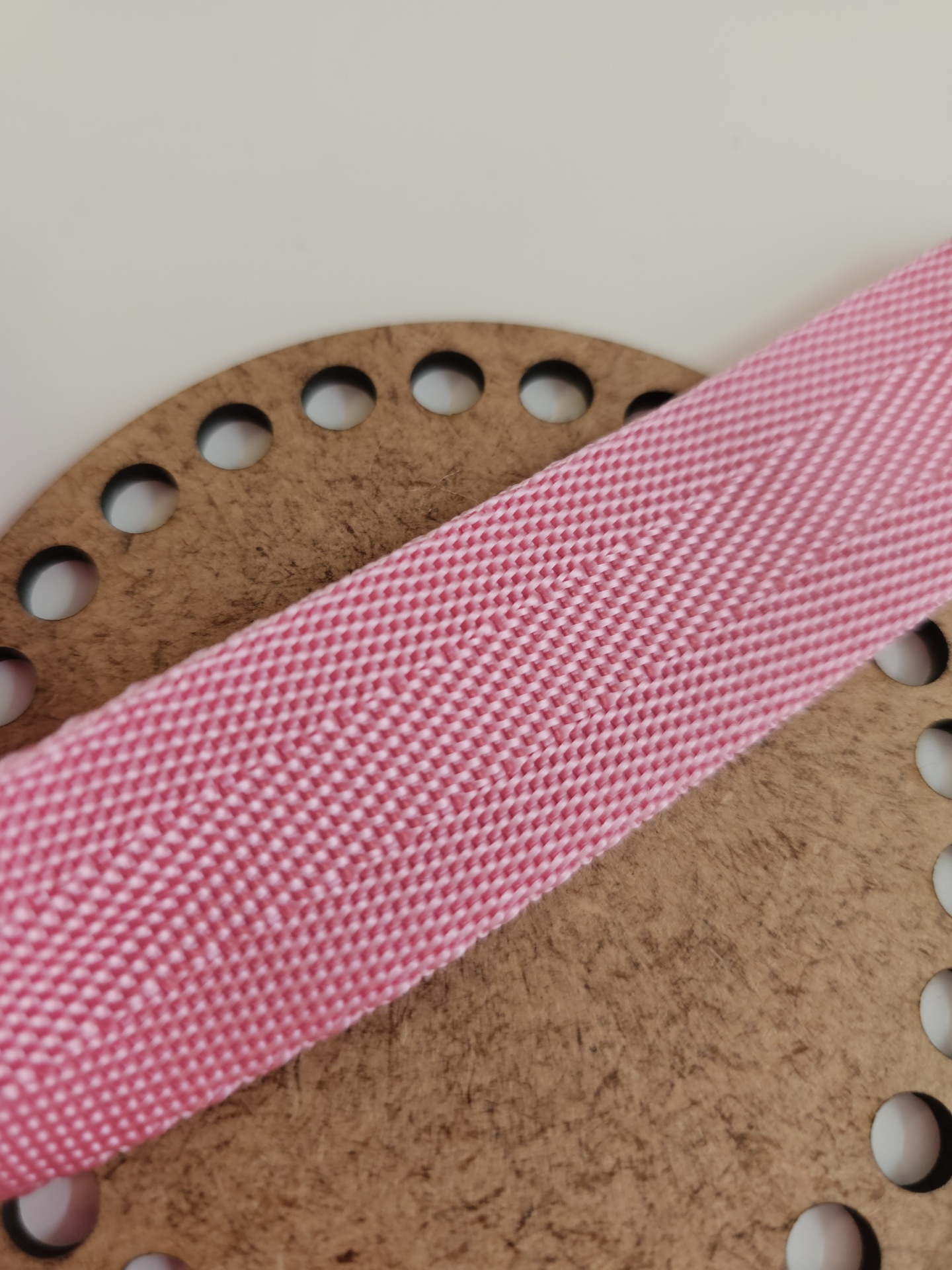 Cinta rosa têxtil com textura sobre base redonda de madeira com buracos