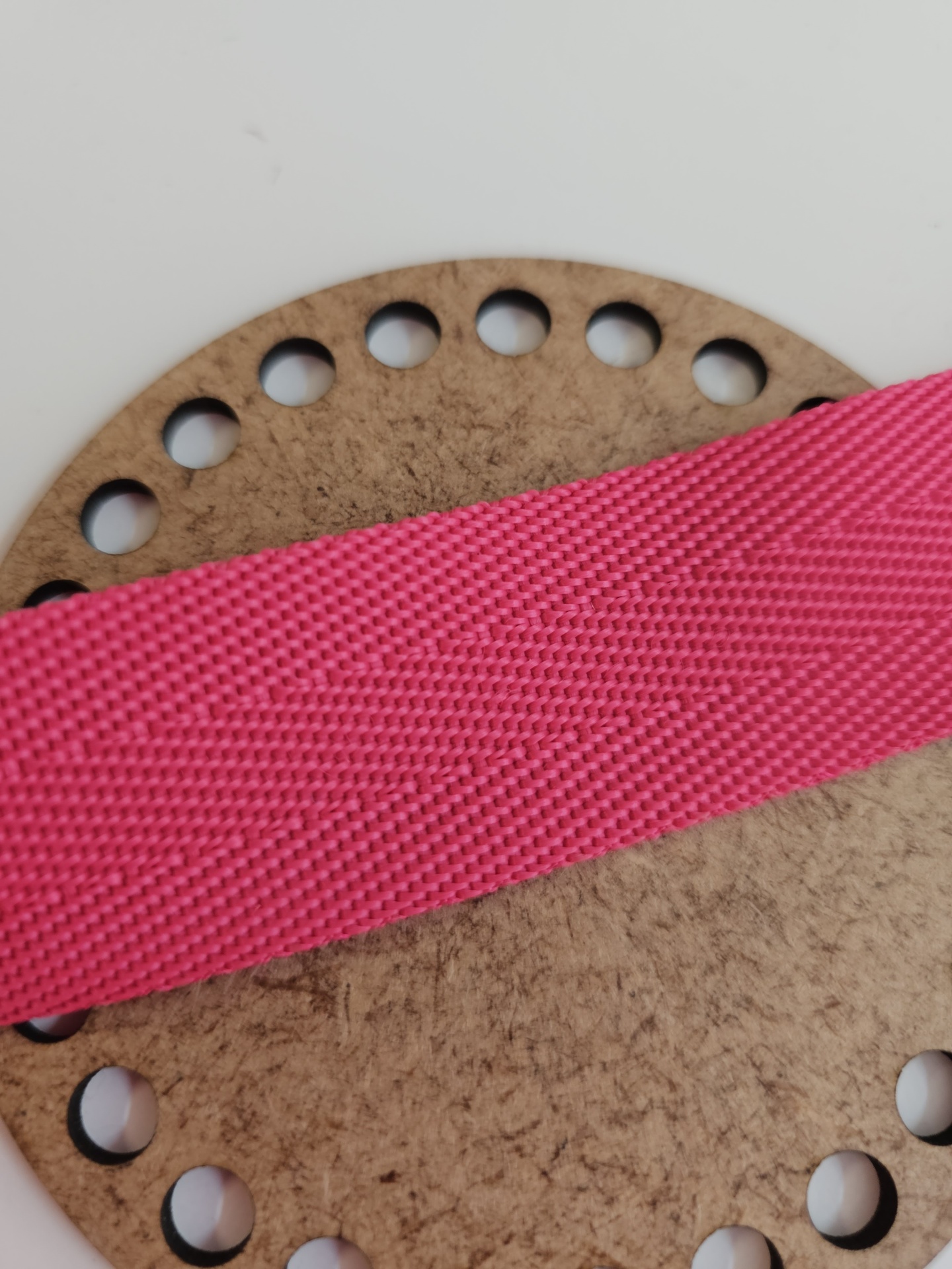 Fita rosa texturada sobre disco redondo de madeira com furos circulares