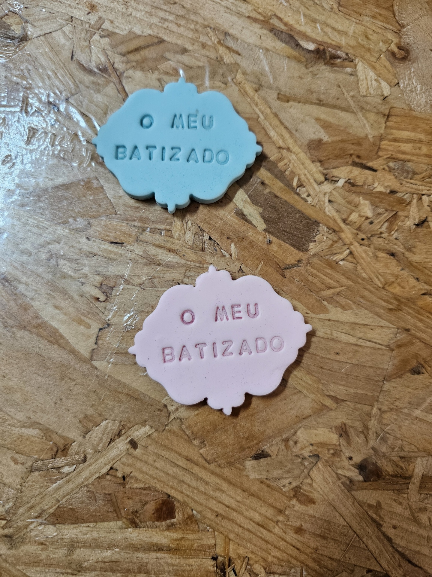 Etiquetas azul claro e rosa com texto 'O MEU BATIZADO' em relevo sobre madeira clara.