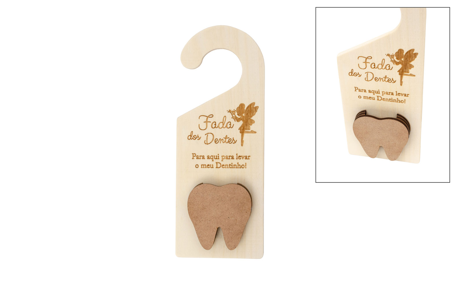 A fada dos dentes está a caminho para levar o dente que caiu! E vai encontrá-lo nesta placa de madeira amorosa com uma caixinha para colocar o dente. A placa é gravada a laser com a frase "Fada dos Dentes. Para aqui para levar o meu dentinho", a decoração é complementada com a gravação da linda Fada.