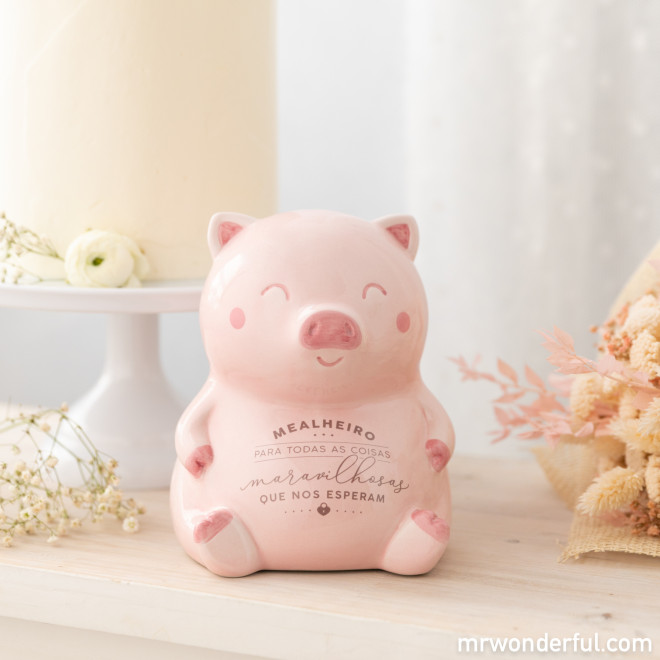 - Mealheiro de cerâmica em forma de porquinho Wonderful, com mensagem dirigida a noivos.