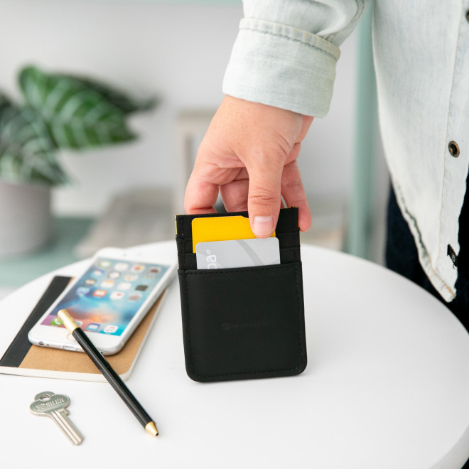 Porta-cartões em formato vertical com acabamentos em PU mate, de alta qualidade, com toque macio e repelente de água.