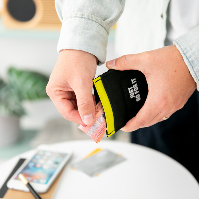 Carteira preta com detalhe amarelo e texto, mãos segurando dinheiro e carteira