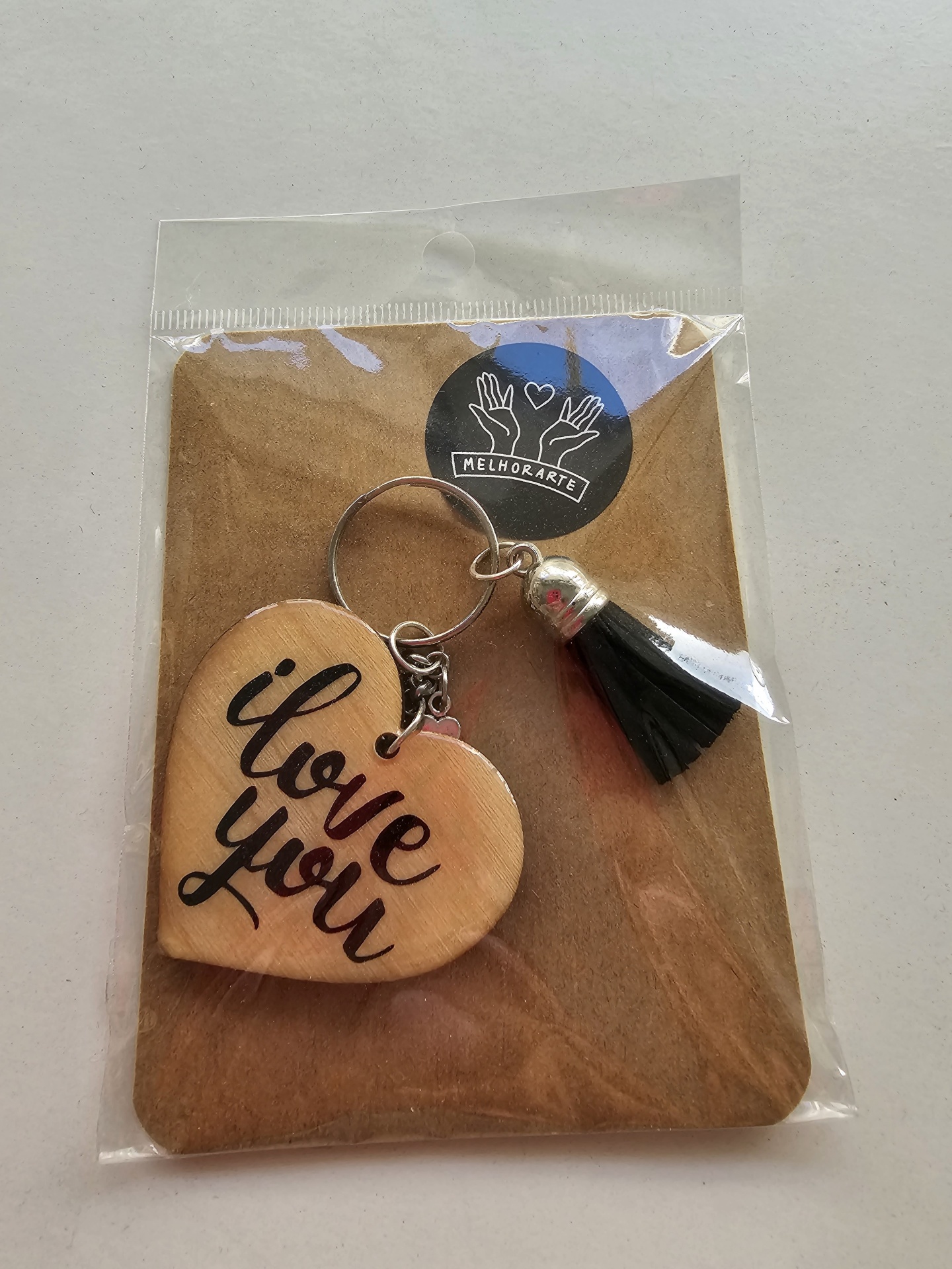 Porta-chaves de coração em madeira clara com texto e tassel preto na embalagem