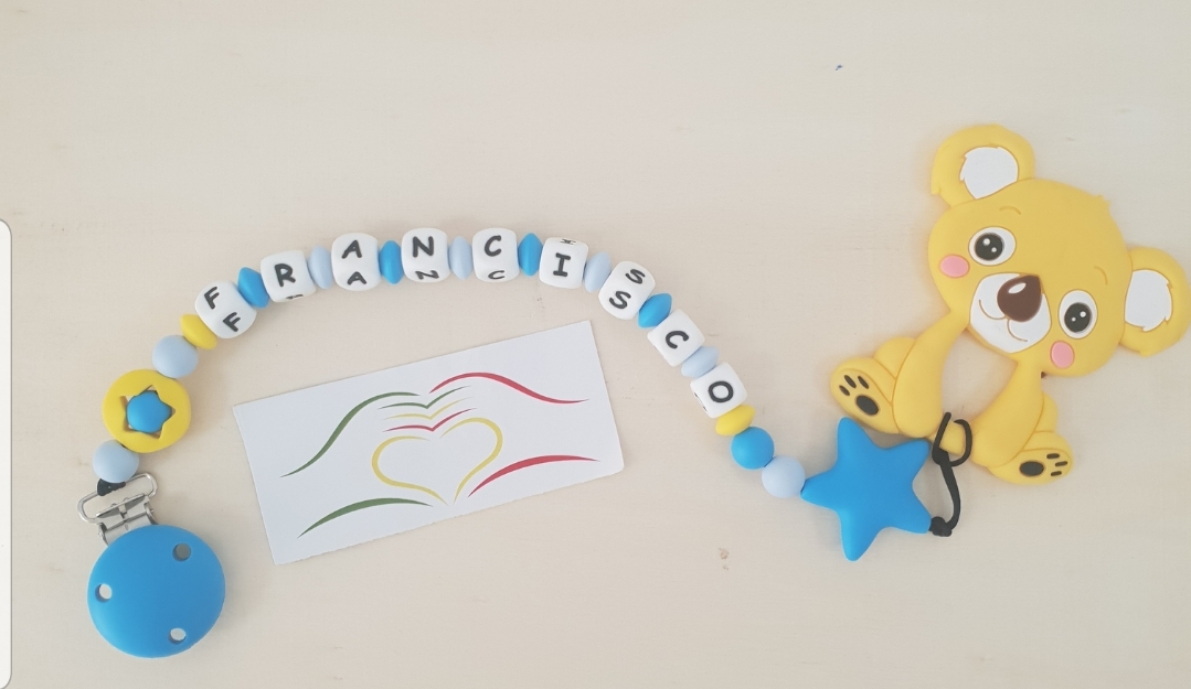 Clipe chupeta personalizado com contas de silicone em azul, branco e amarelo e nome FRANCISCO