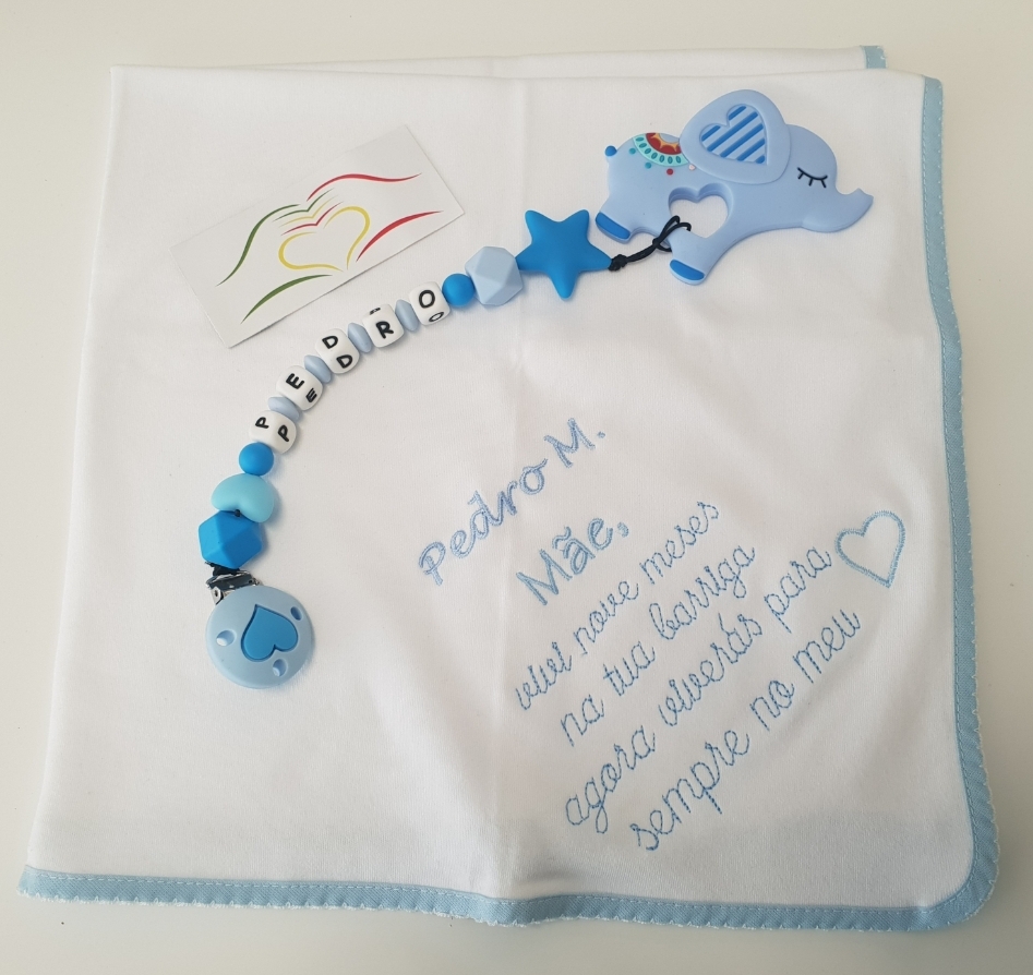 Fralda branca com bordado azul e prendedor de chucha azul com elefante de silicone.