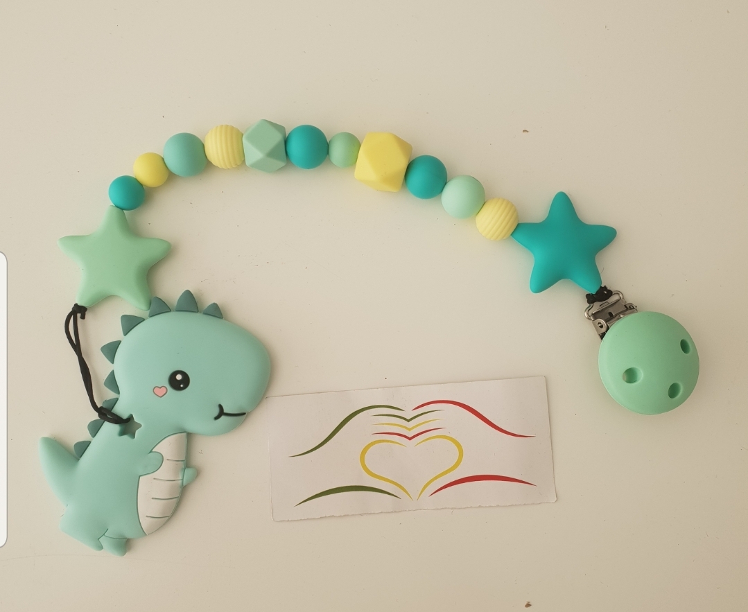 Prendedor de chupeta com contas coloridas e figura de dinossauro verde