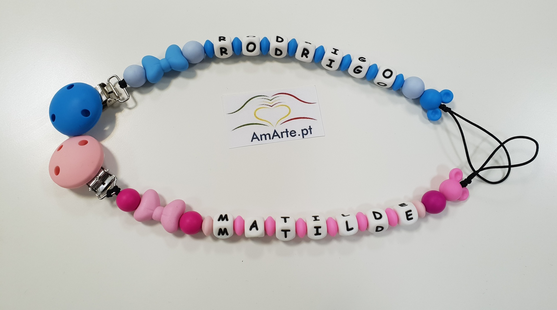 Dois porta-chupetas personalizados em silicone azul e rosa com nomes.
