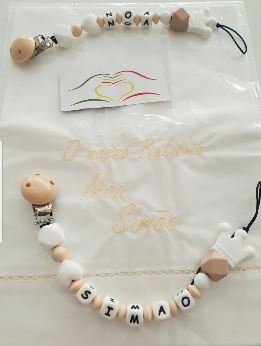 Fechos de chupeta personalizados com contas de silicone e madeira e pano bordado para batismo