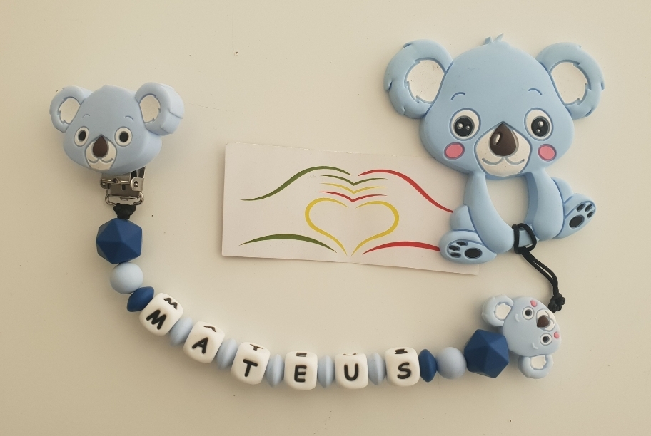 Prendedor de chupeta azul com letras MATEUS e figuras de koala