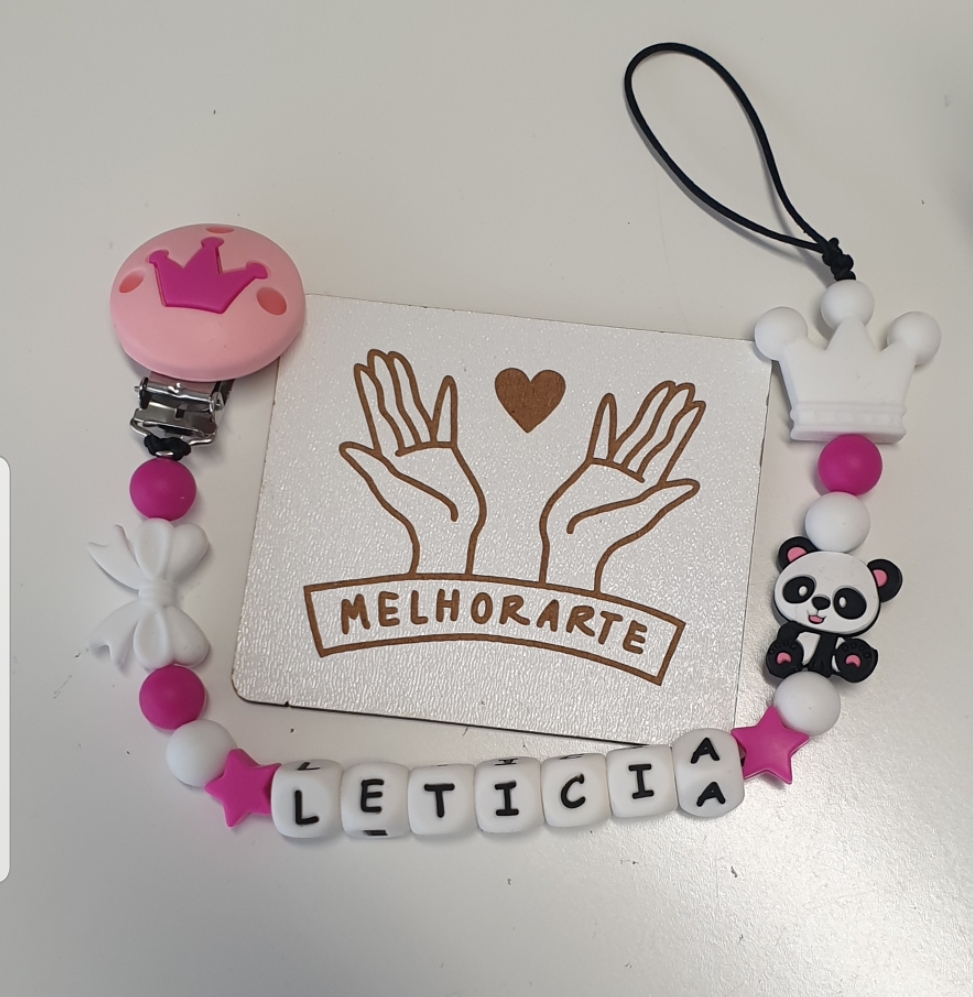 Prendedor de chupeta com contas coloridas e nome LETICIA sobre cartão MELHORARTE