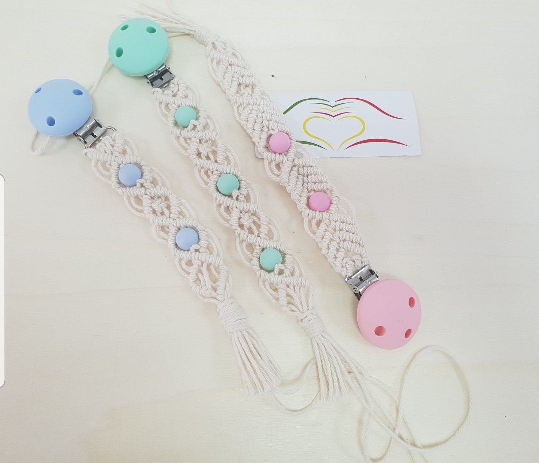 Três presilhas para chupeta em macramé com contas coloridas e clips coloridos sobre fundo claro