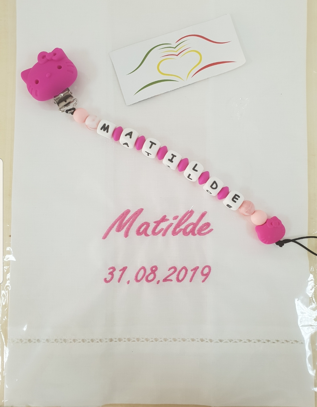 Tecido branco com nome e data bordados em rosa e porta-chupetas personalizado com contas rosa e brancas