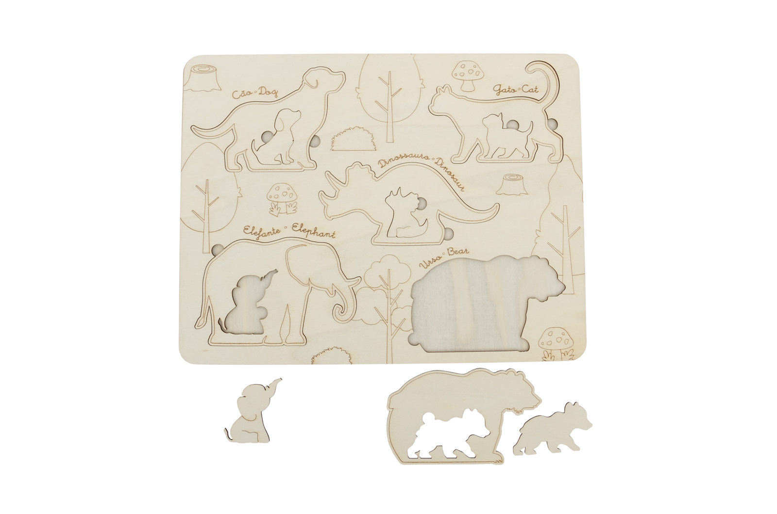 Puzzle de madeira com formas de animais recortadas e etiquetas com nomes em inglês.