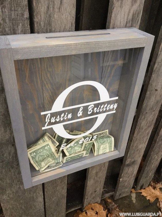 Caixa de madeira cinzenta com vidro e texto branco contendo notas de dólar dentro.