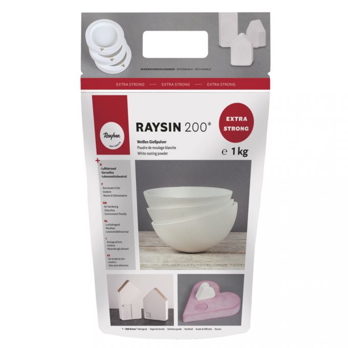 O pó de moldagem "Raysin" é inodoro e neutro do ponto de vista alimentar, simplesmente endurece em contacto com o ar. É branco e vendido em um saco de um quilo. A massa de fundição é de boa qualidade e é particularmente indicada para a fundição de objetos como relevos, figuras, relevos, azulejos, azulejos, mosaicos, painéis decorativos, ornamentos, etc. Um produto muito bom com uma superfície lisa, ideal para DIYers exigentes. A Rayher também dispõe de moldes adequados para este fim. Consulte o catálogo para encontrar o molde certo para si.