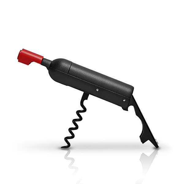 Saca-rolhas multifunções preto com vermelho sobre fundo branco
