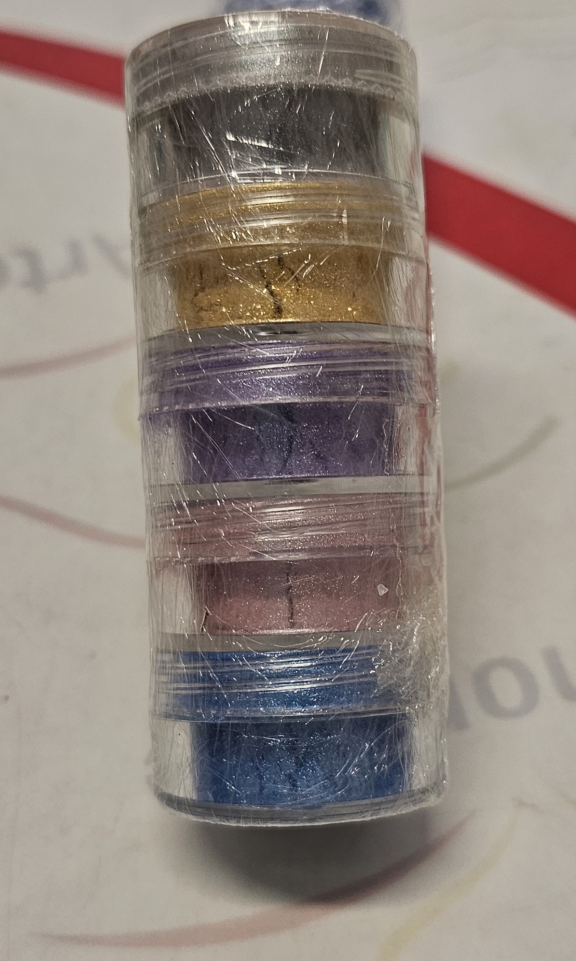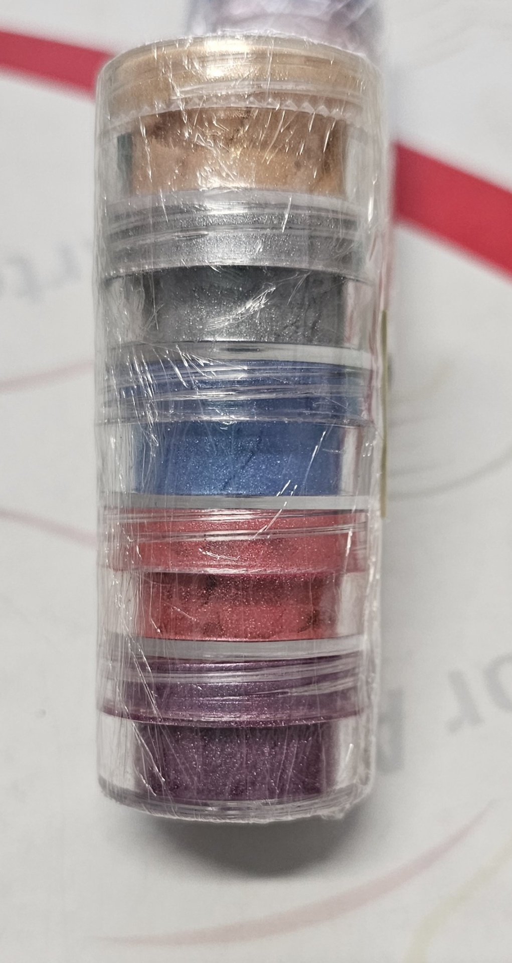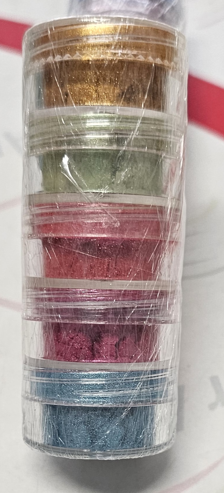 Cinco frascos pequenos com pós coloridos empilhados e embalados em plástico