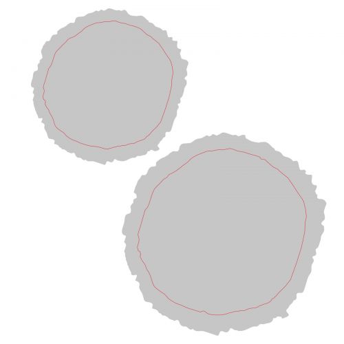 Duas superfícies circulares cinza claro com linhas vermelhas irregulares no centro