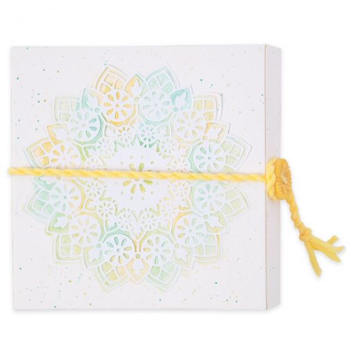 Caixa branca com mandala colorida e fio amarelo