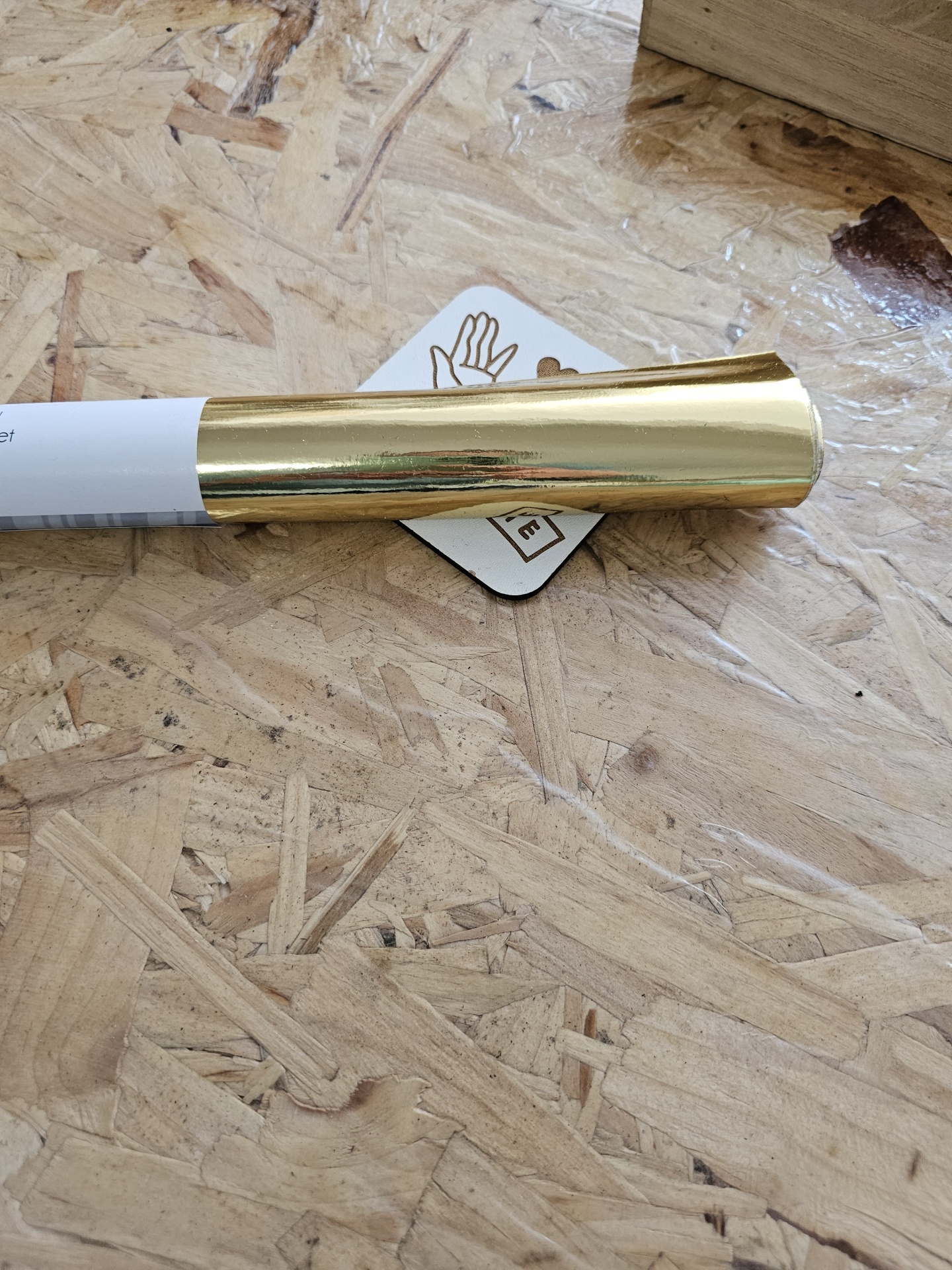 Rolo de papel autocolante dourado brilhante com etiqueta branca e etiqueta MELHOMARTE sobre madeira