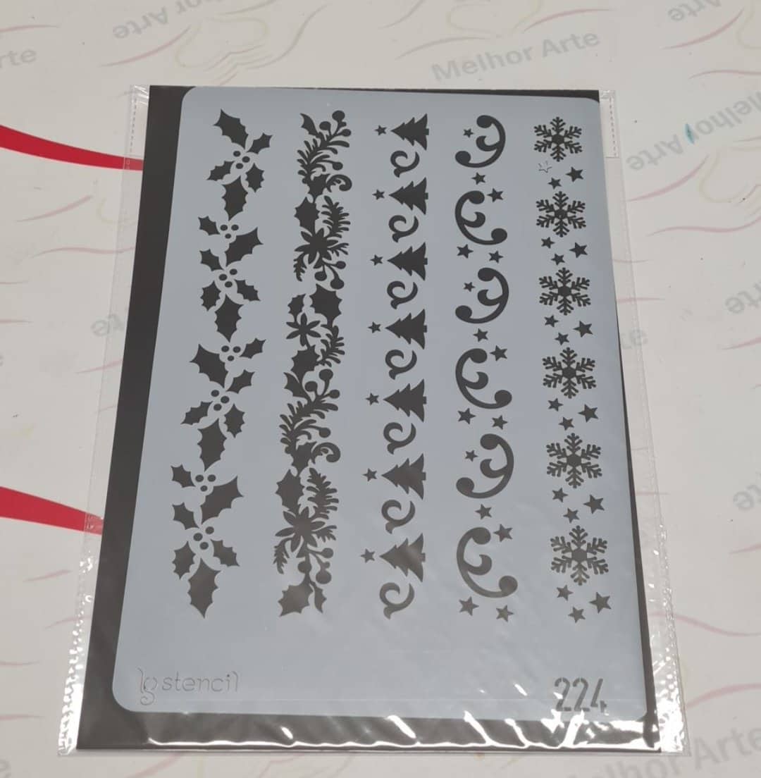 Stencil plástico com padrões decorativos em preto sobre fundo cinzento