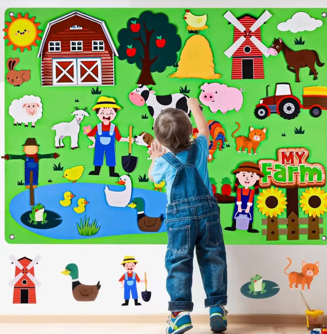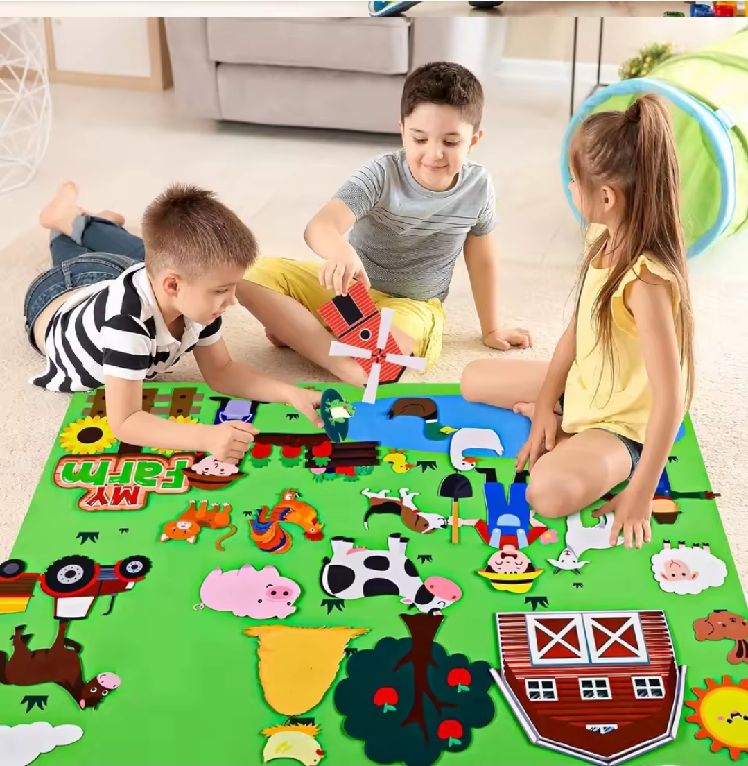 Com 32 peças também em feltro que podem ser colocadas repetidamento para a história que quiser criar.
