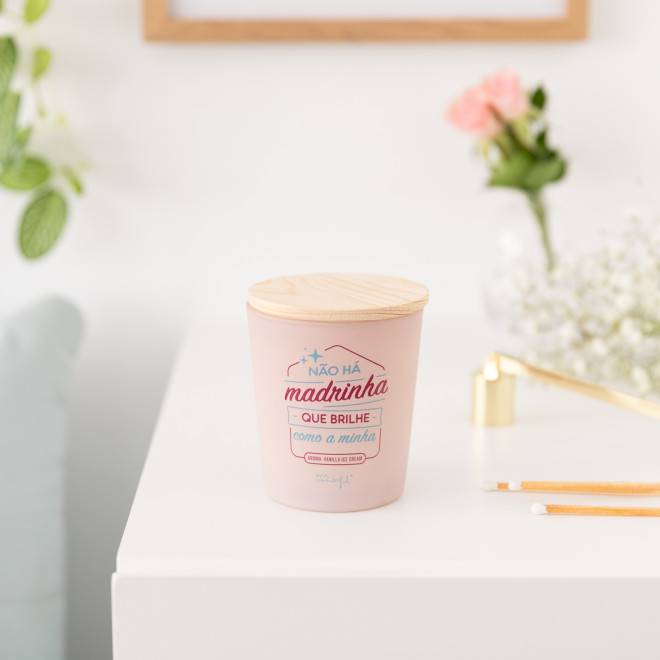 Vela produzida com cera 100 % vegetal fabricada em Espanha, em recipiente de vidro com mensagem dirigida a madrinhas e com tampa de madeira.