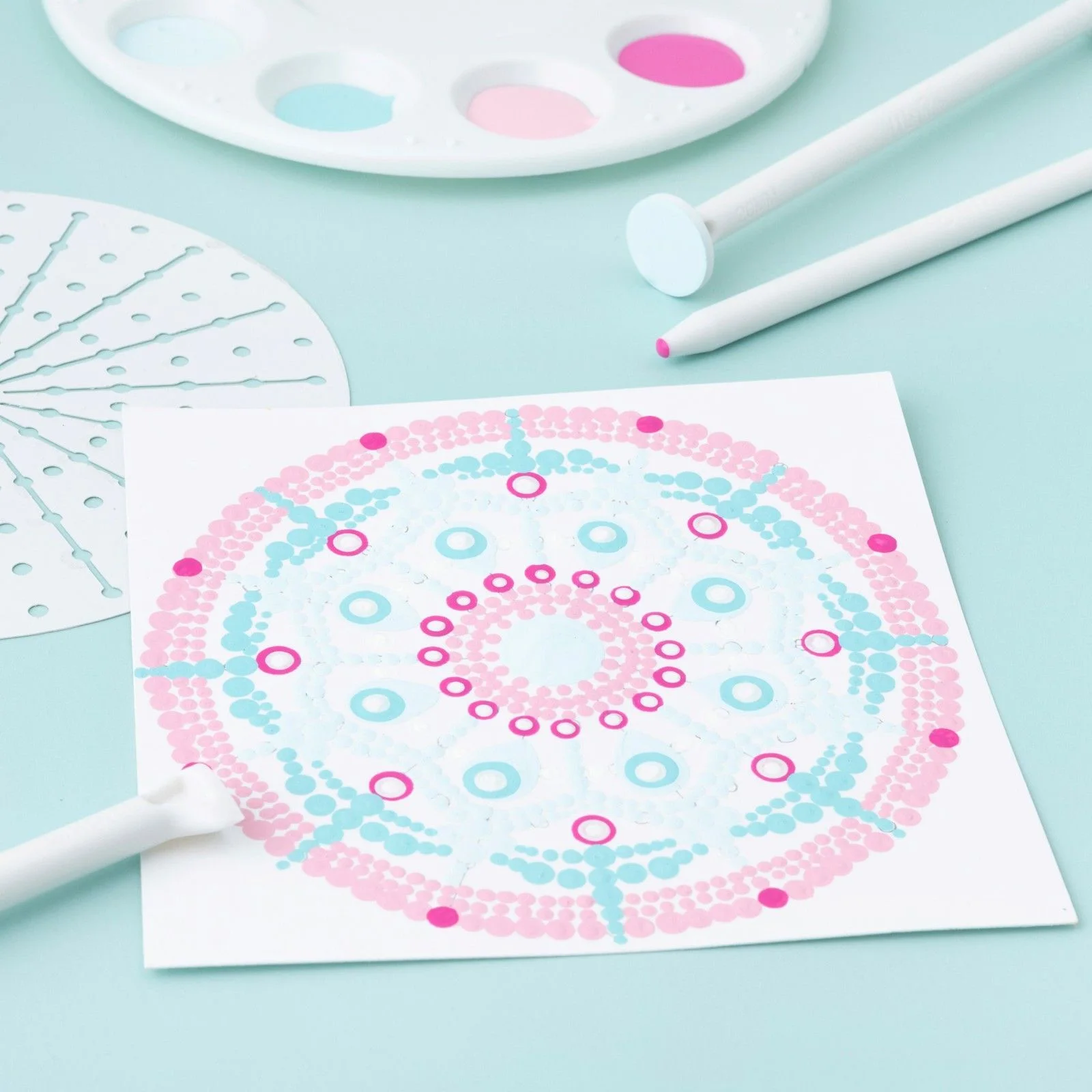 Crie seus próprios padrões meditativos com nossas ferramentas de pontilhamento de mandala, estojo de transporte e guia de estêncil.