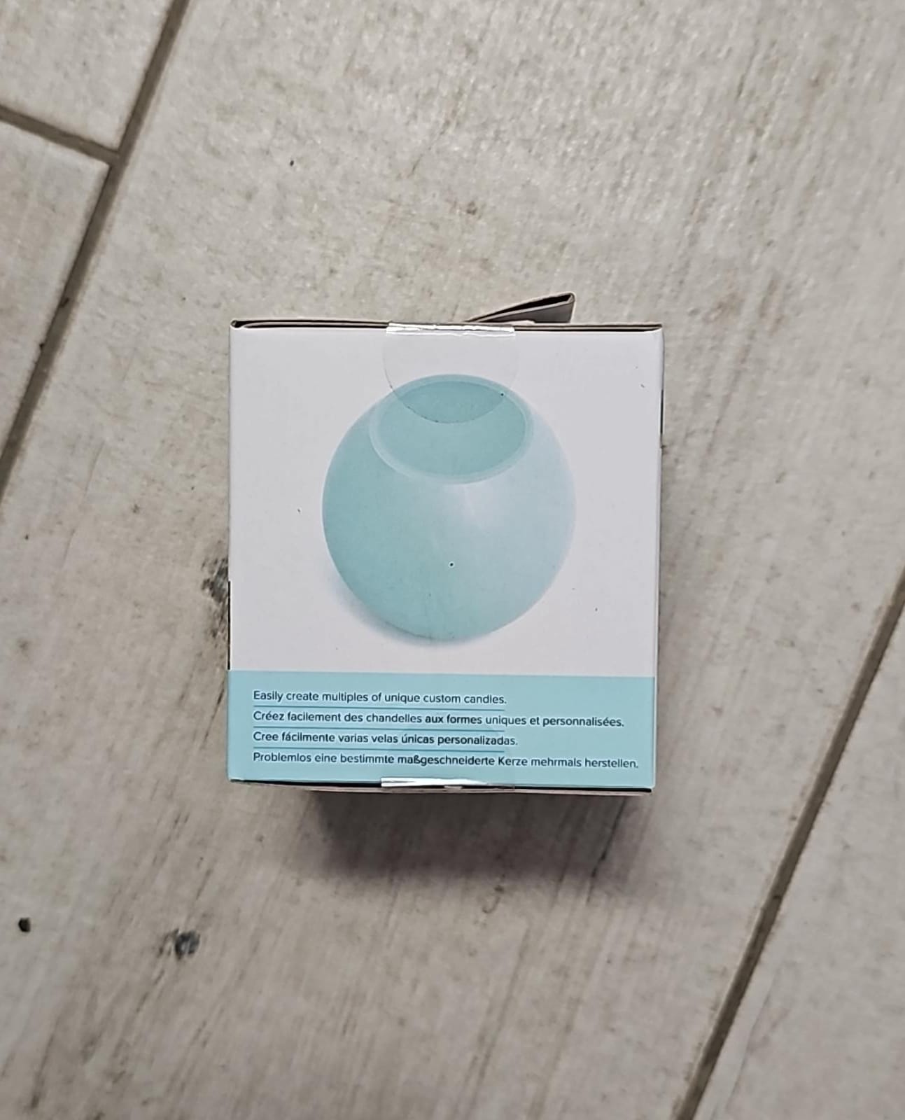 Caixa branca com vela redonda azul claro e texto em vários idiomas