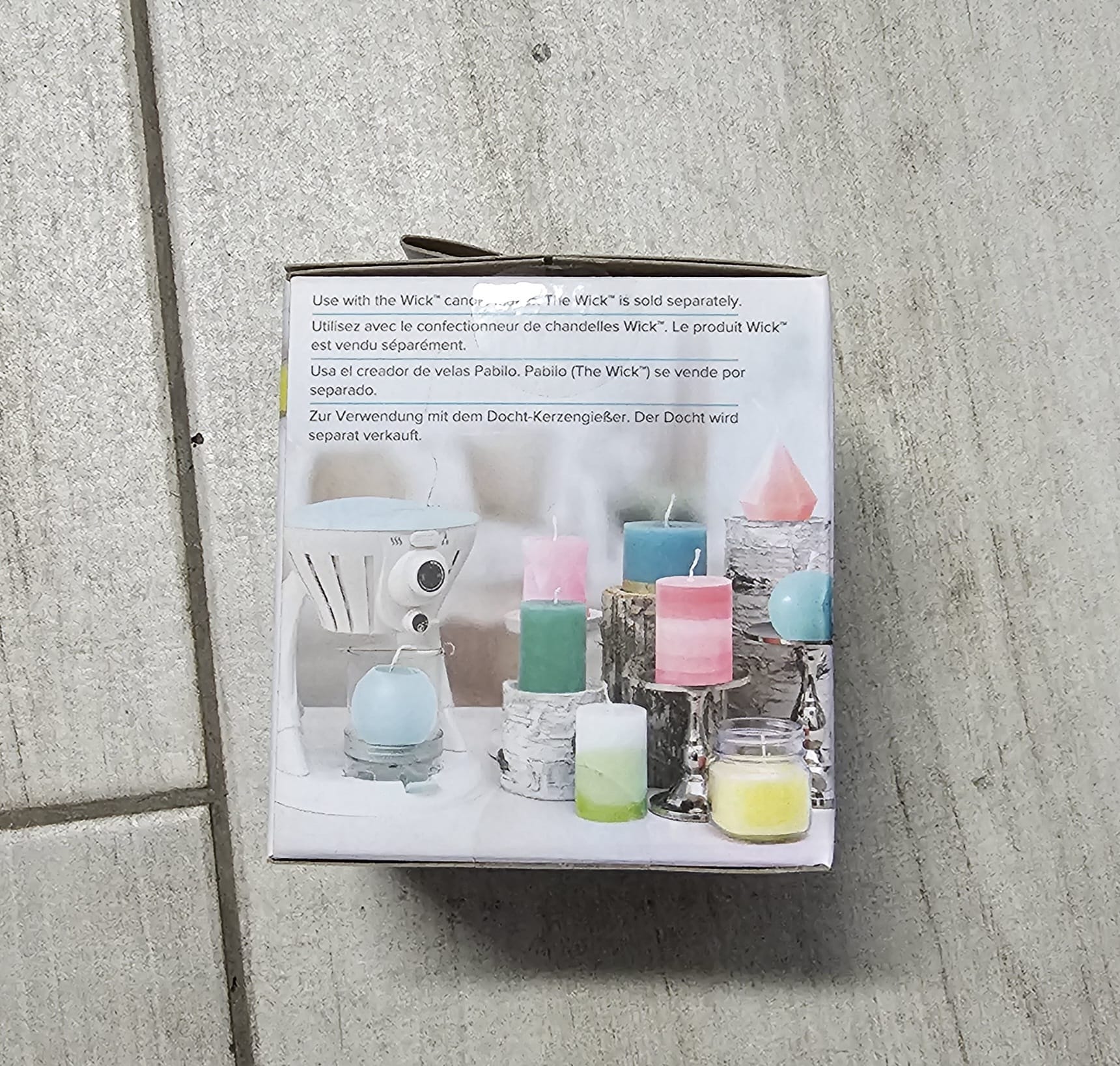 Caixa com imagem de castiçais e velas coloridas com texto multilíngue sobre o pavio Wick